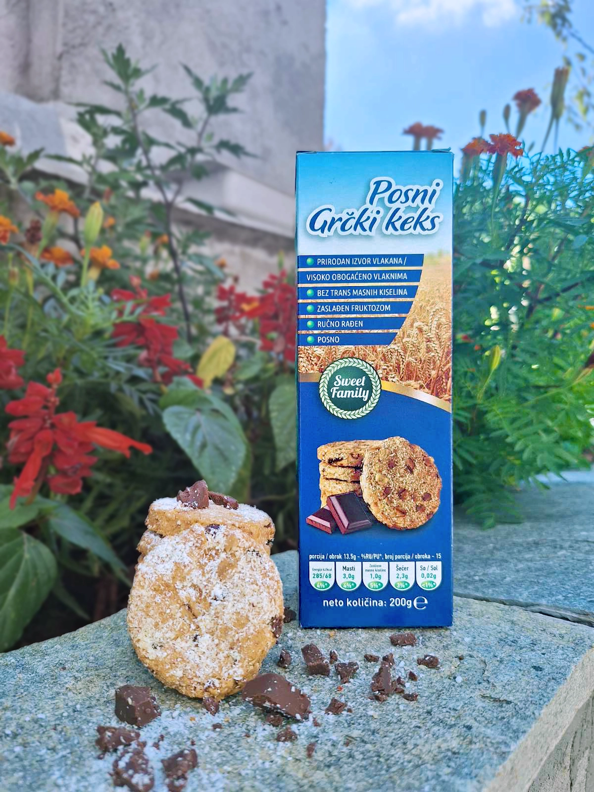 Posni grčki keks kombinuje bogatstvo žitarica i finih dodataka u recepturi osmišljenoj za uživanje bez kompromisa. Pšenično i integralno brašno čine punu osnovu, dok pšenične pahuljice (12%) unose prijatnu hrskavost.
